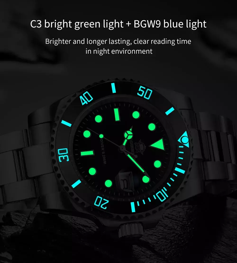 A série H3 utiliza pó superluminoso suíço BGW9 (240.000/kg) no mostrador, ponteiros e moldura.