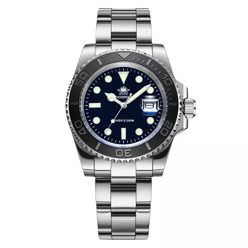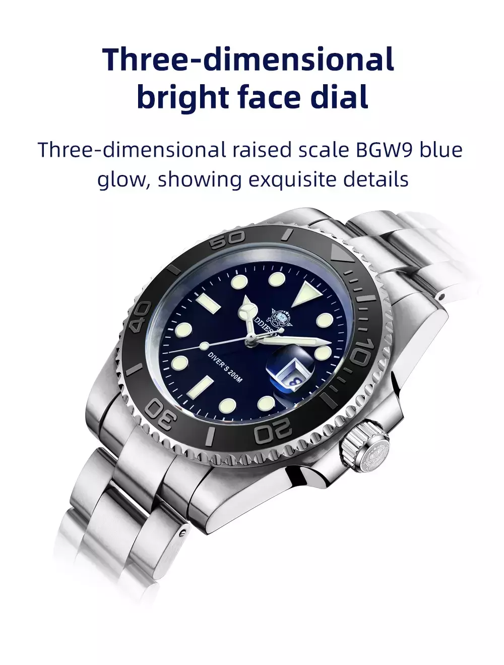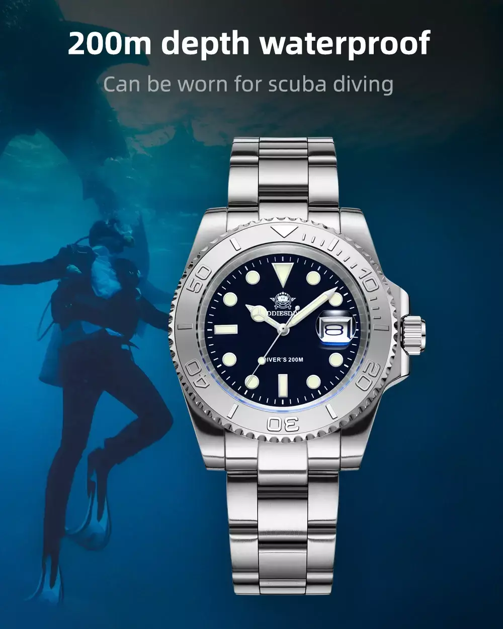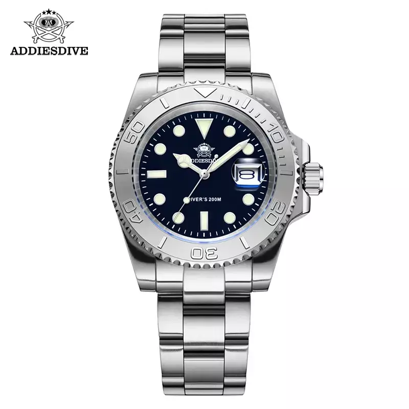 Com aço inoxidável 316L escovado + polido, vidro mineral convexo com anti-reflexo azul e mostrador preto esmaltado, o ADDIESDIVE combina elegância com resistência extrema. Um relógio que comunica força, estilo e autoridade — sem exageros.