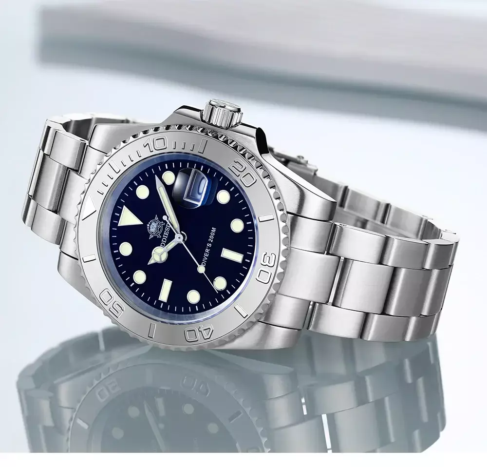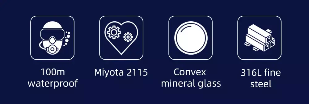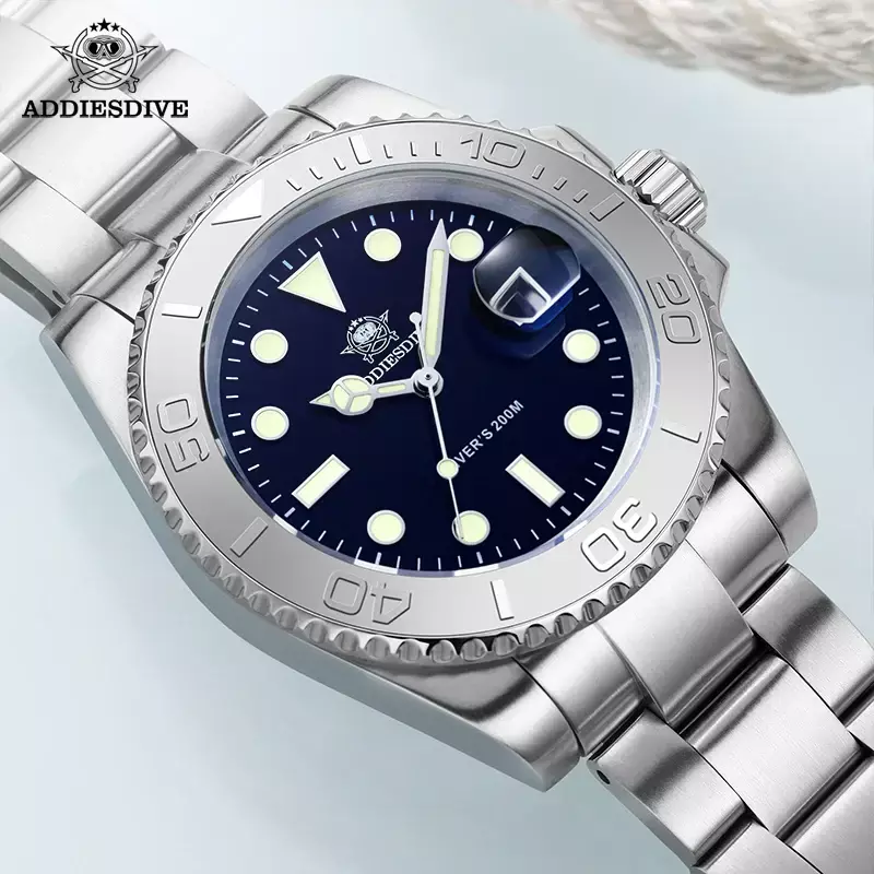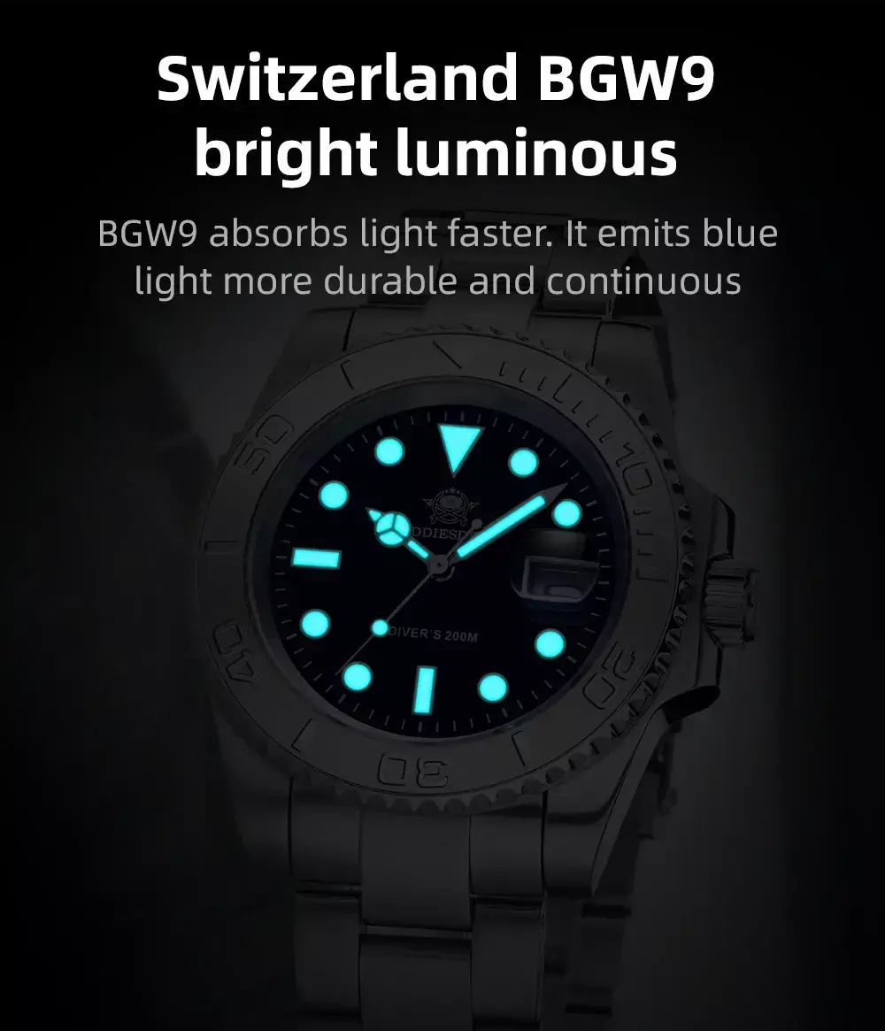 Com aço inoxidável 316L escovado + polido, vidro mineral convexo com anti-reflexo azul e mostrador preto esmaltado, o ADDIESDIVE combina elegância com resistência extrema. Um relógio que comunica força, estilo e autoridade — sem exageros.